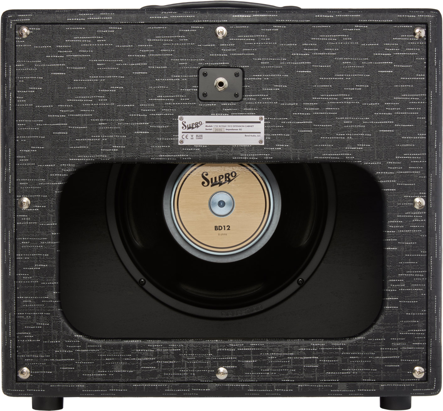 The SUPRO Royale 1x12 Extension Cabinet (1732) features the custom Supro BD12 high-power driver, offering the same mid-range punch and clean articulation as the Royale combo but with additional stage volume. It utilizes a specialty British cone, top-of-the-line suspension and an oversized ceramic magnet.