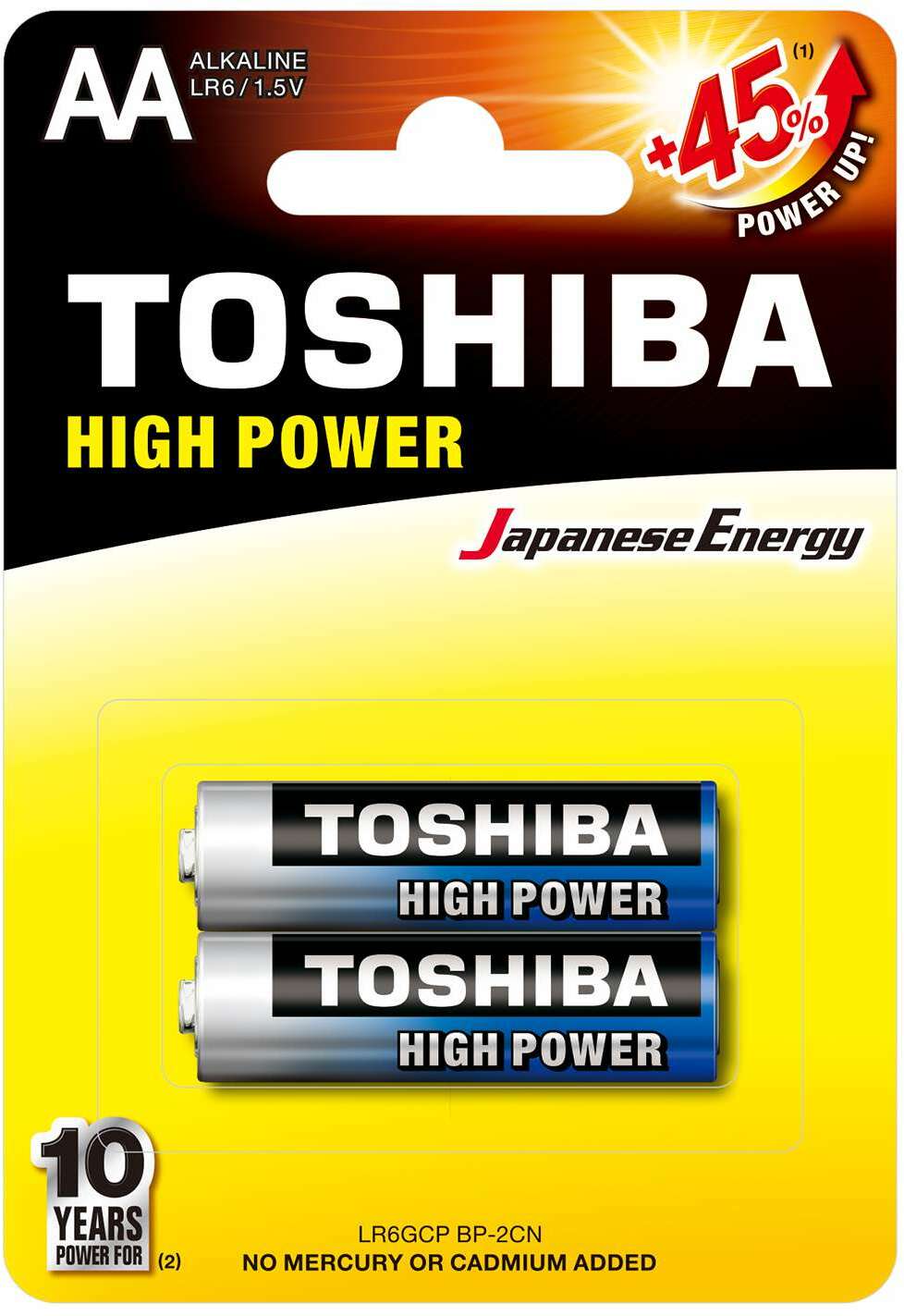 Set of 2 Toshiba AA alkaline batteries, designed according to Japanese standards for the purpose of performance and efficiency.