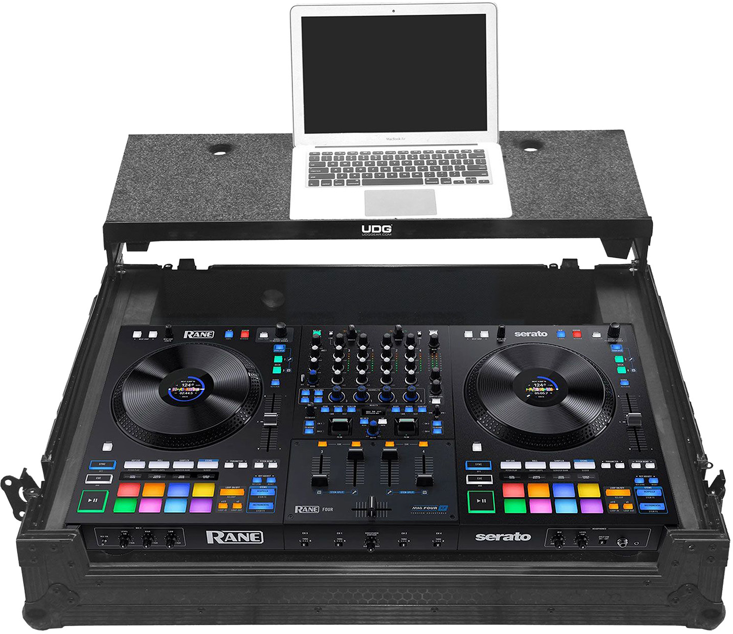 - The UDG Ultimate Flight Case Rane Four Black Plus (Laptop Shelf + Wheels) comes equipped with an additional shelf included for your laptop, mouse, and/or any other devices such as an effects processor and interfaces.