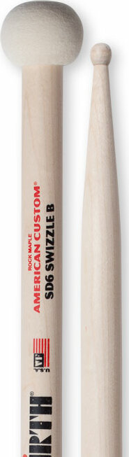 The Bass drum beater VIC FIRTH American custom maple sd6 swizzle is An SD2 Bolero with a hard, spun felt ball attached to the butt end. Ideal for fast changes on cymbals.