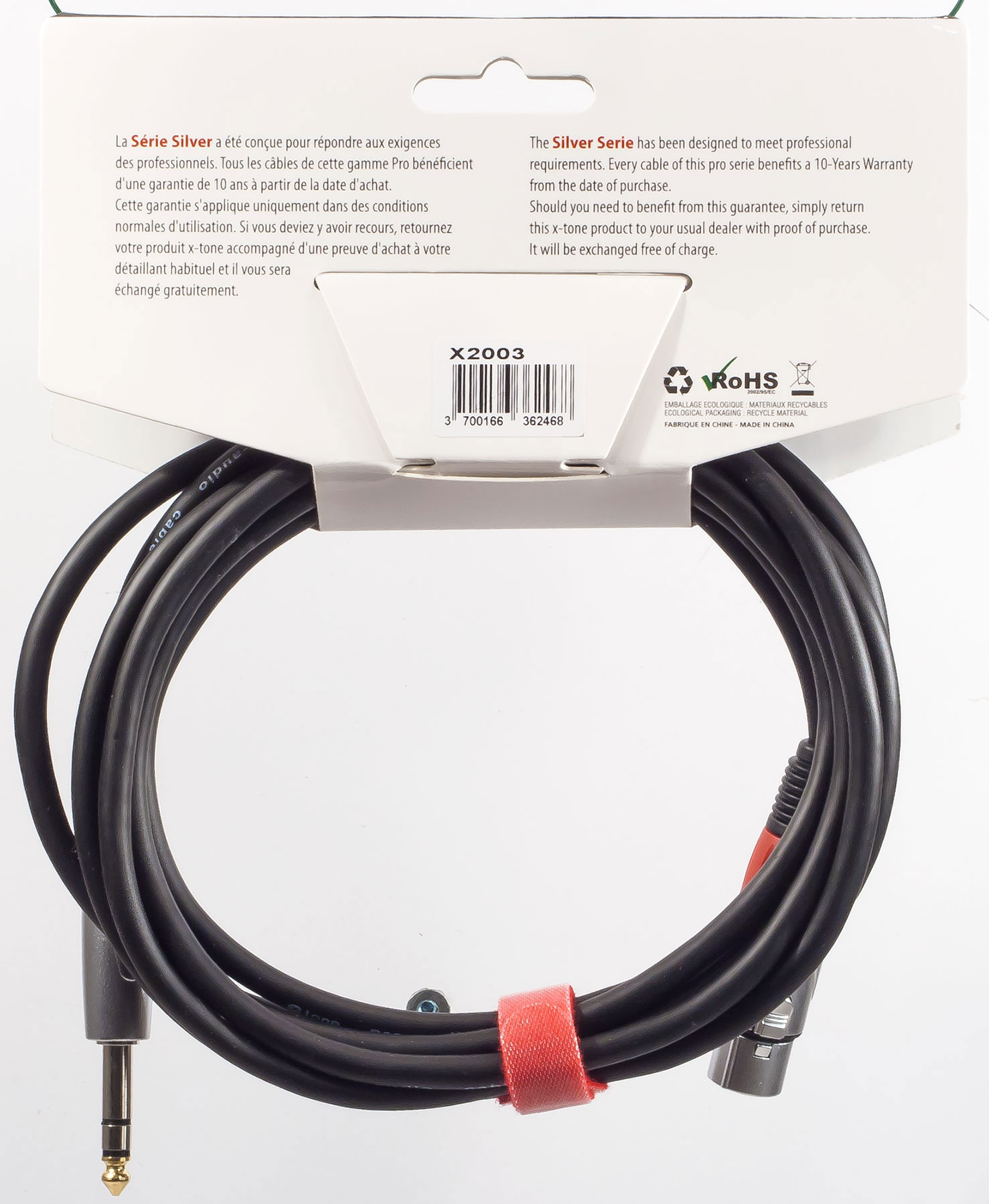 The X-Tone X2003-1,5M cable with a diameter of 6,5mm and a length of 1,5 meter is composed of 1 plug Jack 6,35 stereo to 1 female XLR: The use of premium connectors and conductors allows the X-tone brand to offer a 10-year warranty on the Silver Series.
