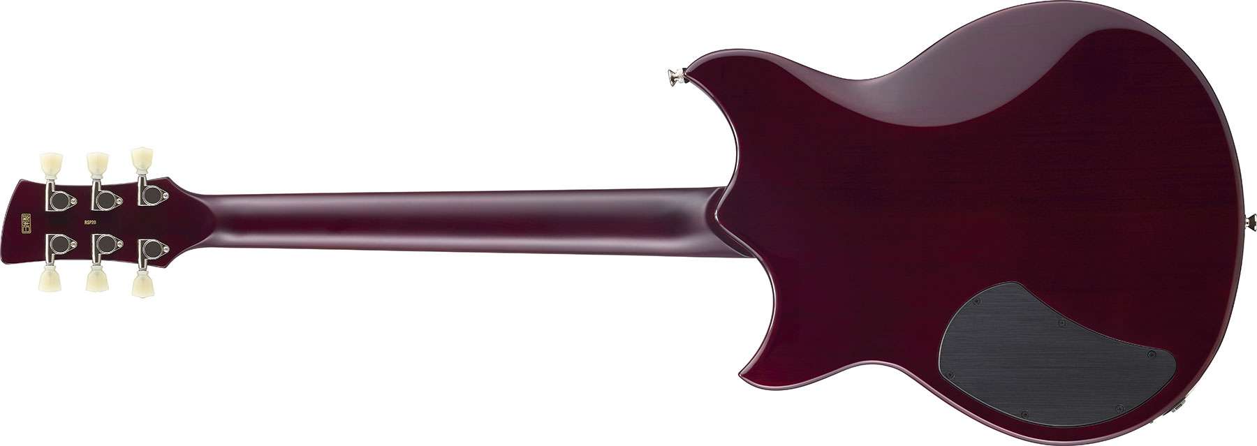 YAMAHA Revstar Standard RSS02T (SSB) is a chambered solid body electric guitar, featuring a Mahogany body, Maple top, a three pieces Mahogany set-neck with 22 stainless steel frets Rosewood fretboard (scale 24.75"), AlNiCo V P90 style single coil pickups and tone pot with push-pull "Focus Switch" which activates a passive boost with an effect similar to overwound pickups — darker highs, increased mids and lows, and an aggressive character.